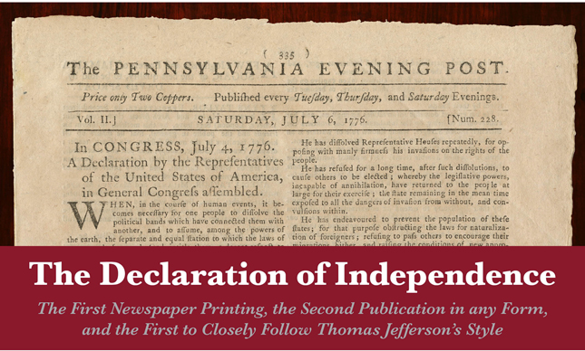 I am pleased to announce our offering of a very rare printing of the Declaration of Independence. Benjamin Towne’s July 6 Pennsylvania Evening Post was the first newspaper to print the Declaration, and only the second printing in any format. It will be sold at public auction in New York on June 25, 2013, by Robert A. Siegel Auction Galleries, as part of their 50th annual Rarities of the World sale.