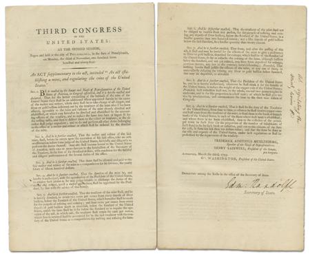 [EDMUND RANDOLPH]. An Act Supplementary to the Act, Intituled “An Act Establishing a Mint, and Regulating the Coins of the United States.” #23241 $6,750
