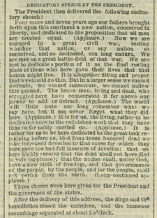 In addition to the AP omission of the word “poor,” the phrase “We are met to dedicate” is recorded as “We have come to dedicate” in Lincoln’s written copies, and the words “carried on,” found here and in Lincoln’s second draft, were replaced by Lincoln with “advanced” in subsequent copies. The Philadelphia Enquirer version of the text, picked up by Frank Leslie’s Illustrated Newspaper contains variations of familiar lines, most notably in the final two sentences regarding the nation’s unfinished work and closing phrase of “Government of the people, for the people, and for all people” rather than the more familiar “of the people, by the people, and for the people.”